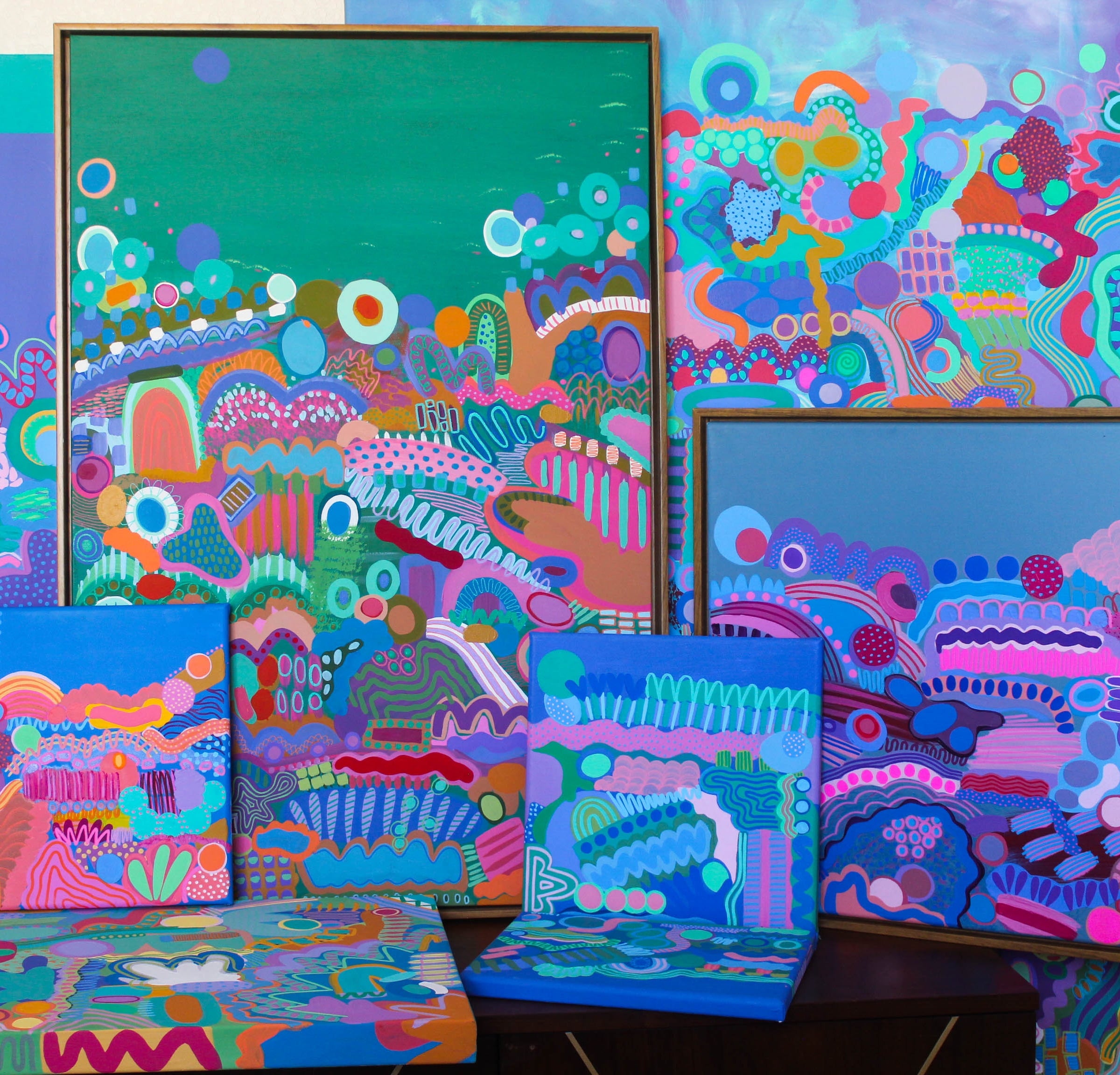 One-of-a-kind abstract diptych created on two stretched canvases (18 × 36 in each). The twin canvases feature vibrant, playful color palettes and a thoughtfully balanced composition that spans both pieces. Gallery-quality, ready to hang, and ideal for contemporary interiors, offices, or collector display. This unique paired set will not be replicated.