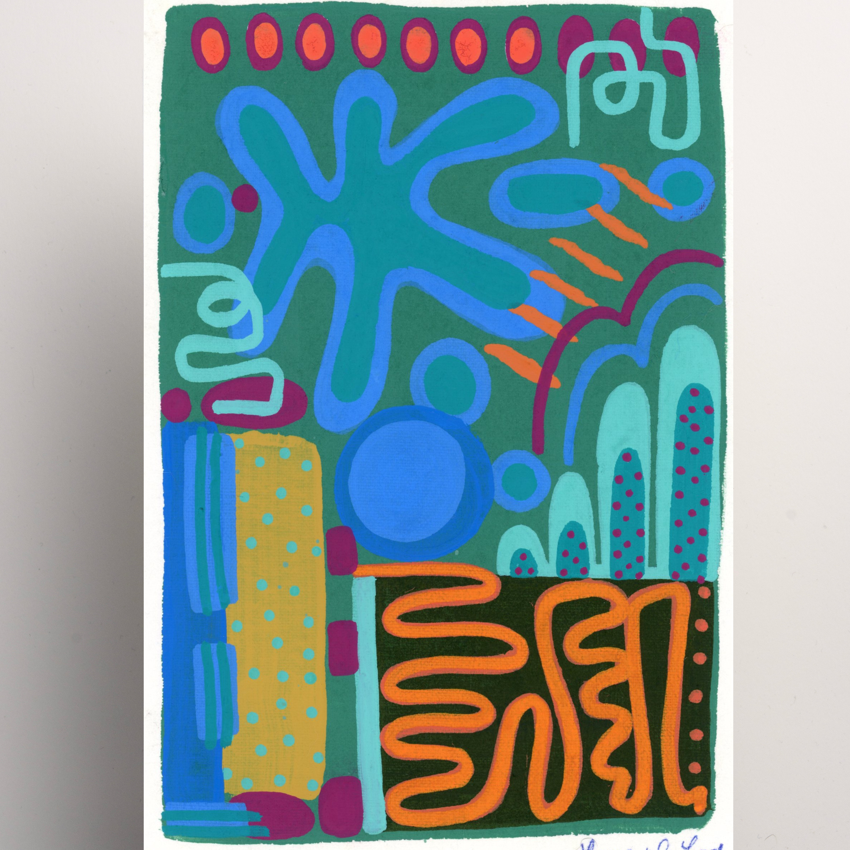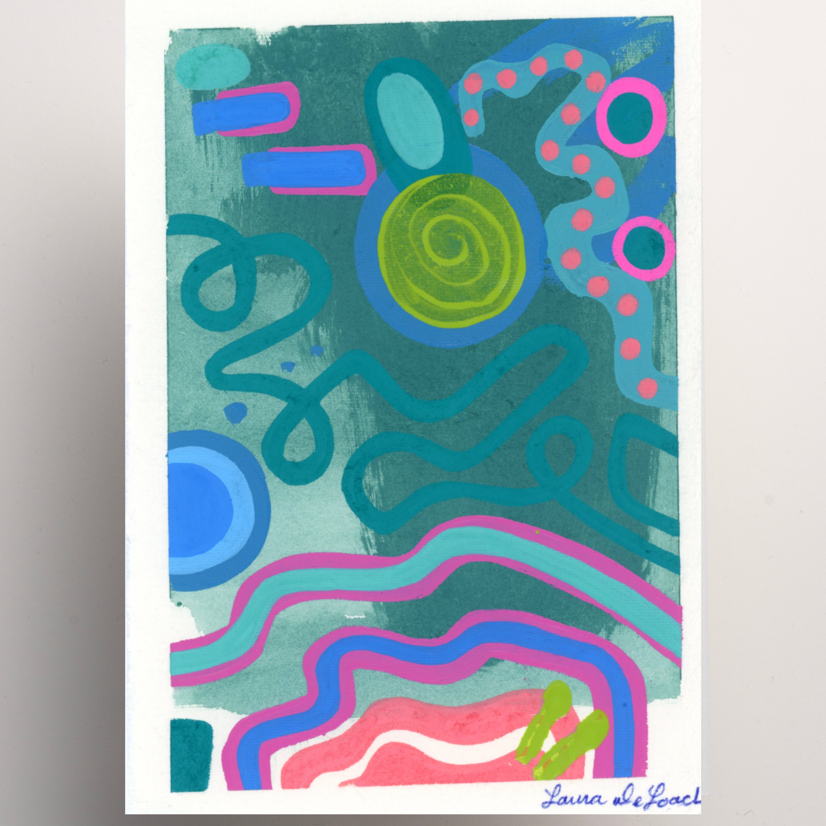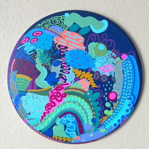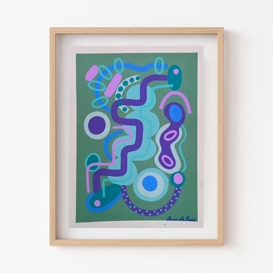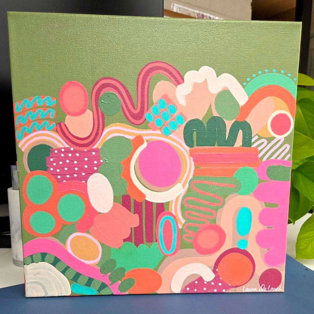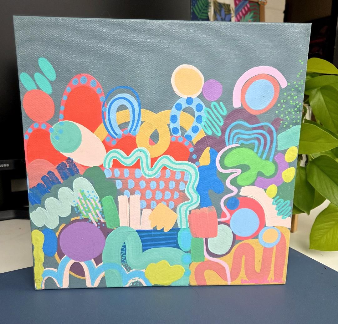 This one-of-a-kind canvas is hand painted with acrylic paints, featuring vibrant, layered colors that create a dynamic abstract design. Each brushstroke adds depth and movement, making the piece truly unique. No two are alike, and prints will not be recreated for this specific piece. Price includes frame.