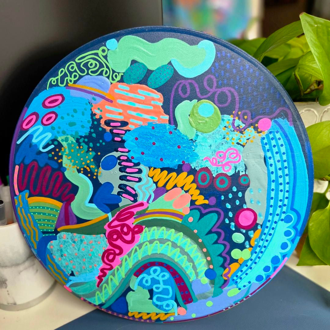 This complex abstract artwork is painted on a solid wooden round and features bright, dynamic colors that whimsically move together across the surface. The flowing forms and layered details create a sense of motion and playfulness, making it a unique statement piece that blends organic material with expressive, contemporary design. This piece is one of a kind with no copies created.